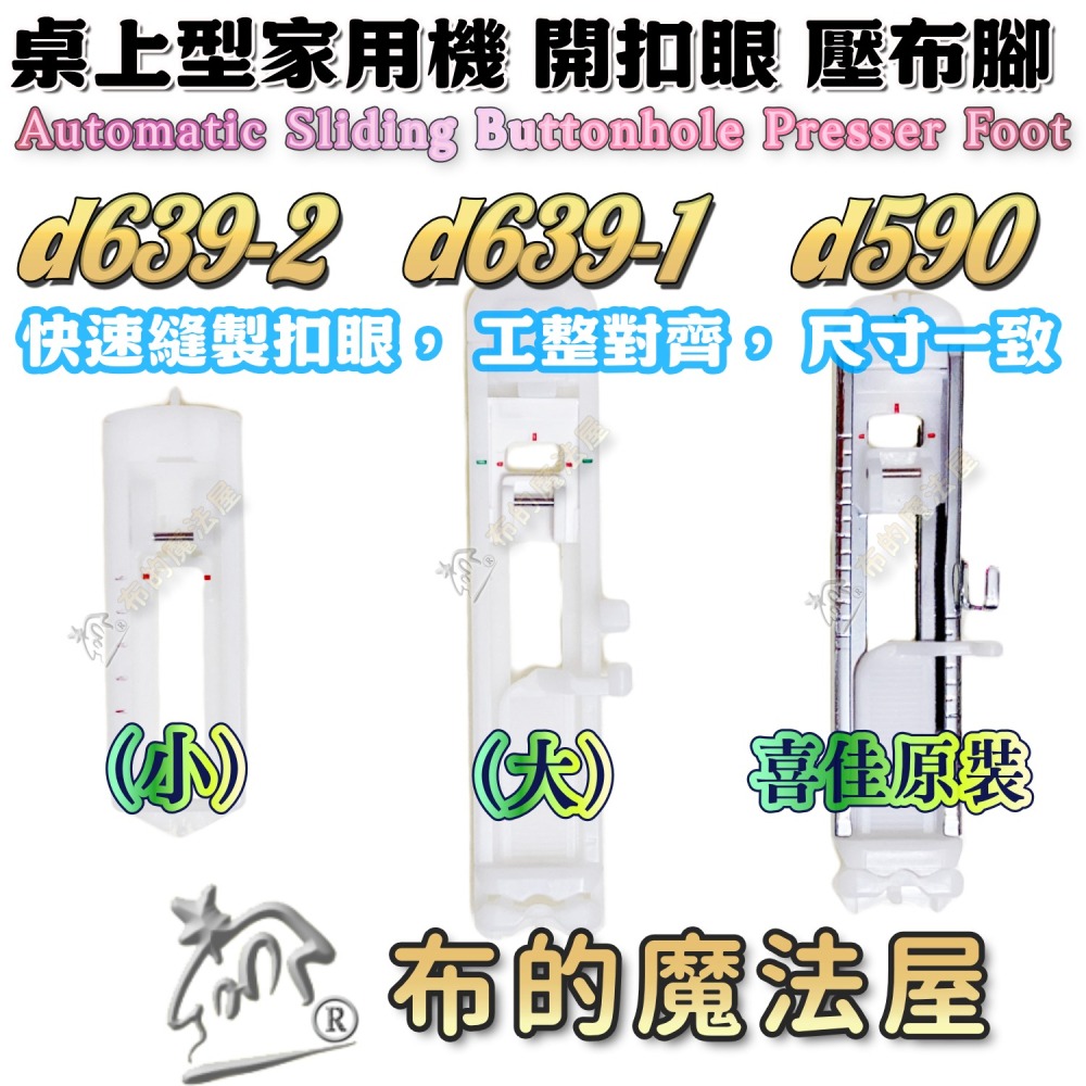 ★ d590和d639-1都是一步驟開扣眼,可一次完成開釦眼的動作。適用於家庭用縫紉機,不需再推動釦眼拉柄,即可重複開釦眼。若有綴補縫、重止縫等花樣,亦可使用。