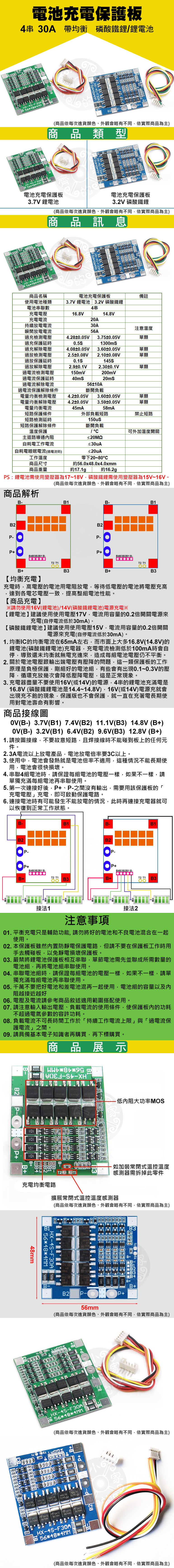 ●適用:標準3.7V鋰電池4串/3.2V磷酸鐵鋰電池4串