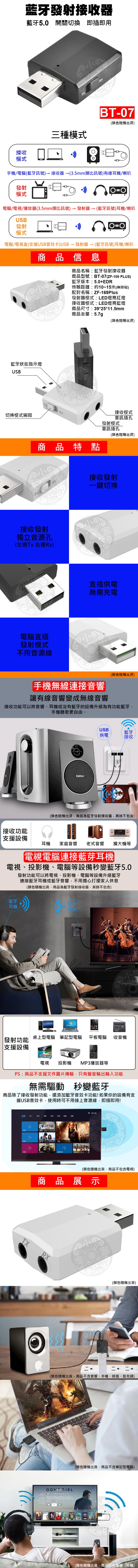 ●內容物:BT-07 / 3.5mm音源線 / 說明書
