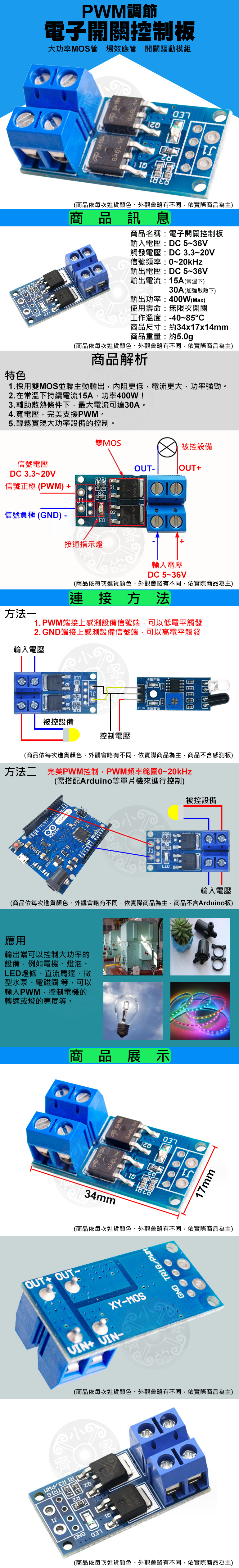 ●完美PWM控制,PWM頻率範圍0~20kHz (需搭配Arduino等單片機來進行控制)