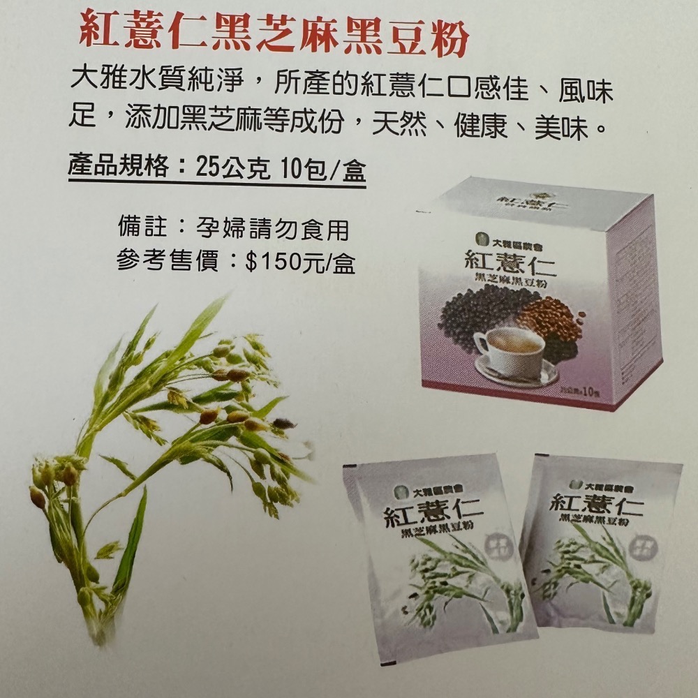 大雅水質純淨,所產的紅薏仁口感佳、風味足,添加黑芝麻等成分,天然、健康、美味。
