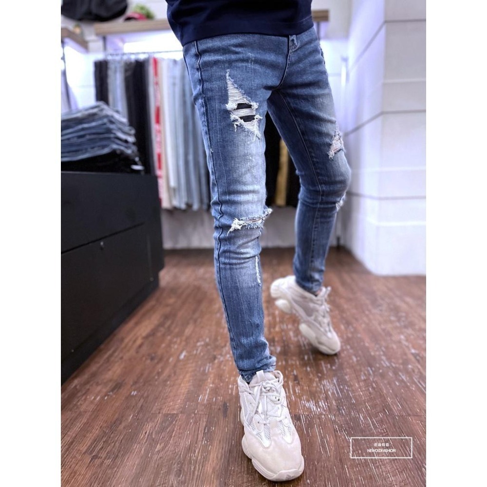 重磅淺藍刷破彈性牛仔布料! 三洞貓鬚破壞,內襯跳色補丁設計! 修身版型,彈性超級好! 六個尺寸(S、M、L、XL、XXL、XXXL) *麻豆174/60穿M30腰尺寸拍照!