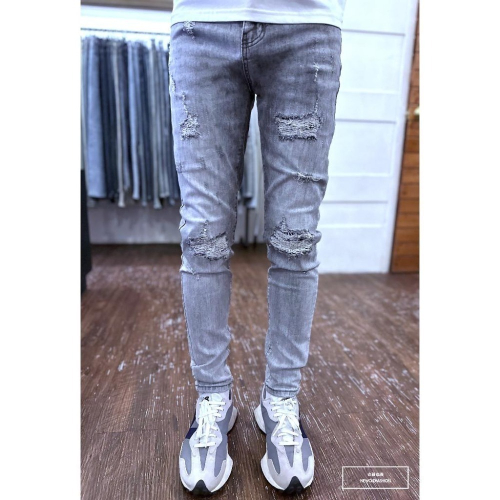 『新品上市』重磅縫線變形蟲補丁小直筒 煙灰水泥灰 牛仔破褲 顯瘦修身窄管 補丁破壞 男生牛仔褲(NOF23063895)
