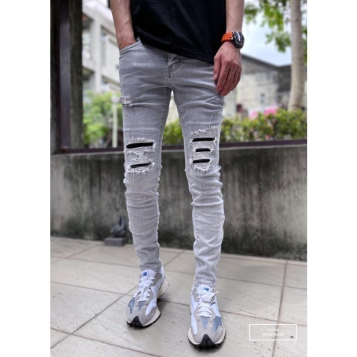 『老爺有喜』重磅淺灰白雙膝黑補丁小直筒褲 水泥灰 牛仔破褲 顯瘦修身窄管 補丁破壞 淺色牛仔褲(NOF2204993)