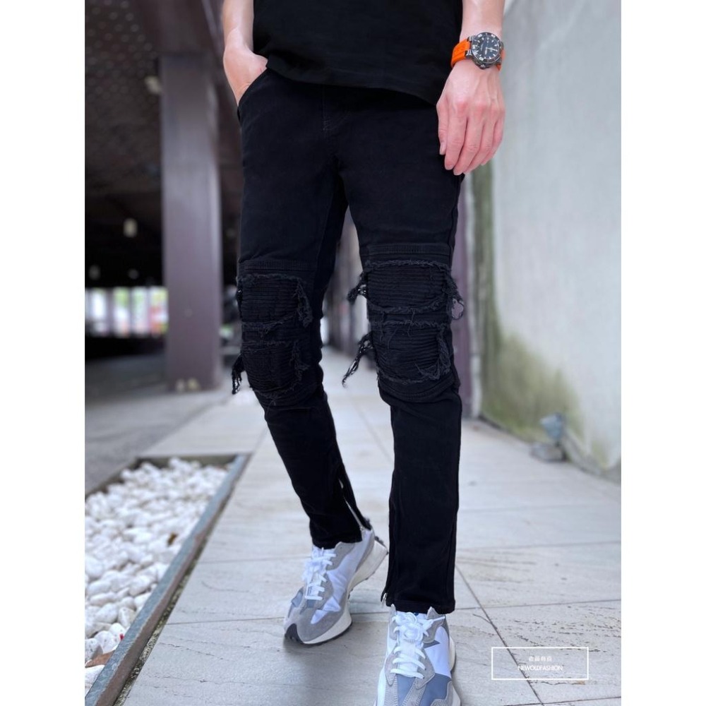 重磅闇黑單寧牛仔布料! 膝蓋對稱破壞、抓皺補丁造型 彈性修身不卡卡! 五個尺寸(S、M、L、XL、XXL) *麻豆174/60穿M號尺寸拍照!