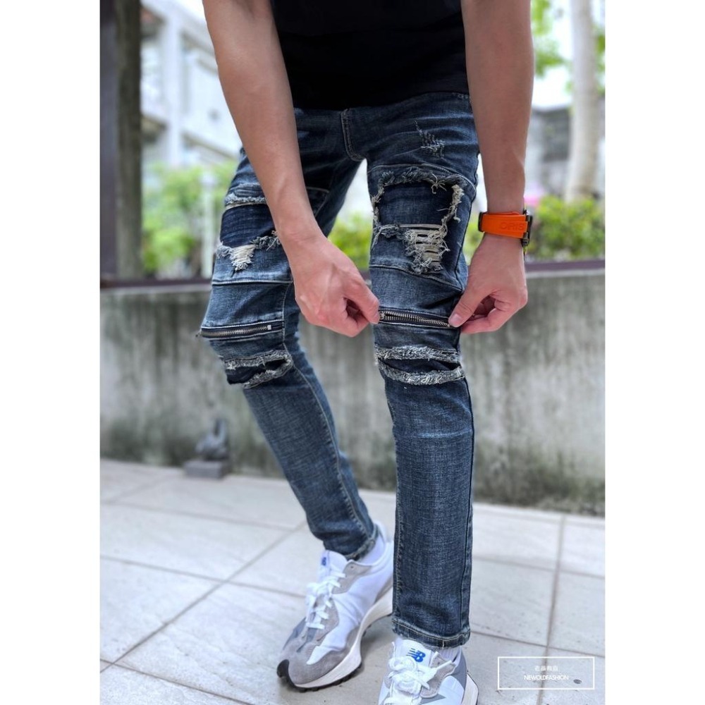 『老爺有喜』重磅深藍補丁膝拉鍊小直筒褲 機車褲 彈性牛仔破褲 顯瘦修身窄管 補丁破壞牛仔褲(NOF22033330)