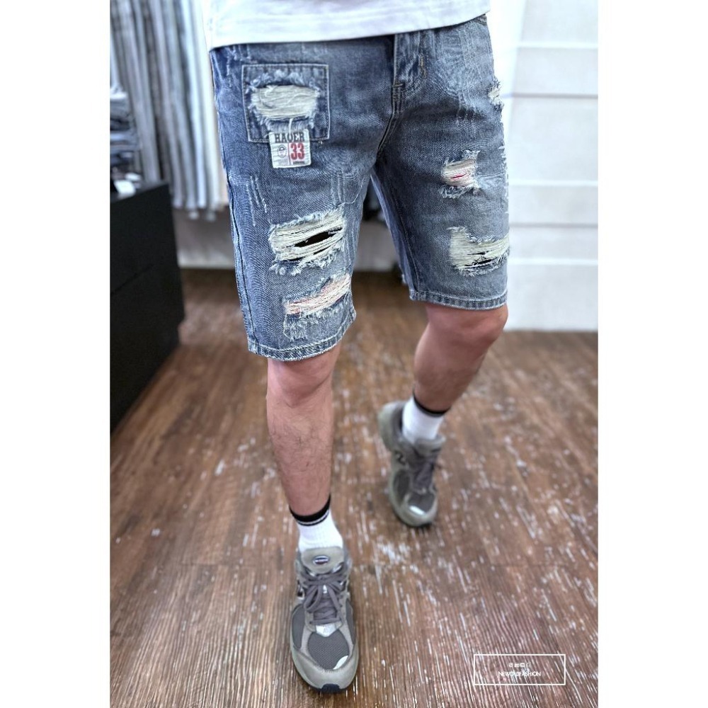 『新品上市』重磅HAOER紅補丁破壞牛仔短褲 破壞抽鬚 日系 阿美咔嘰 五分褲 牛仔褲 男生短褲(NOF2303909)