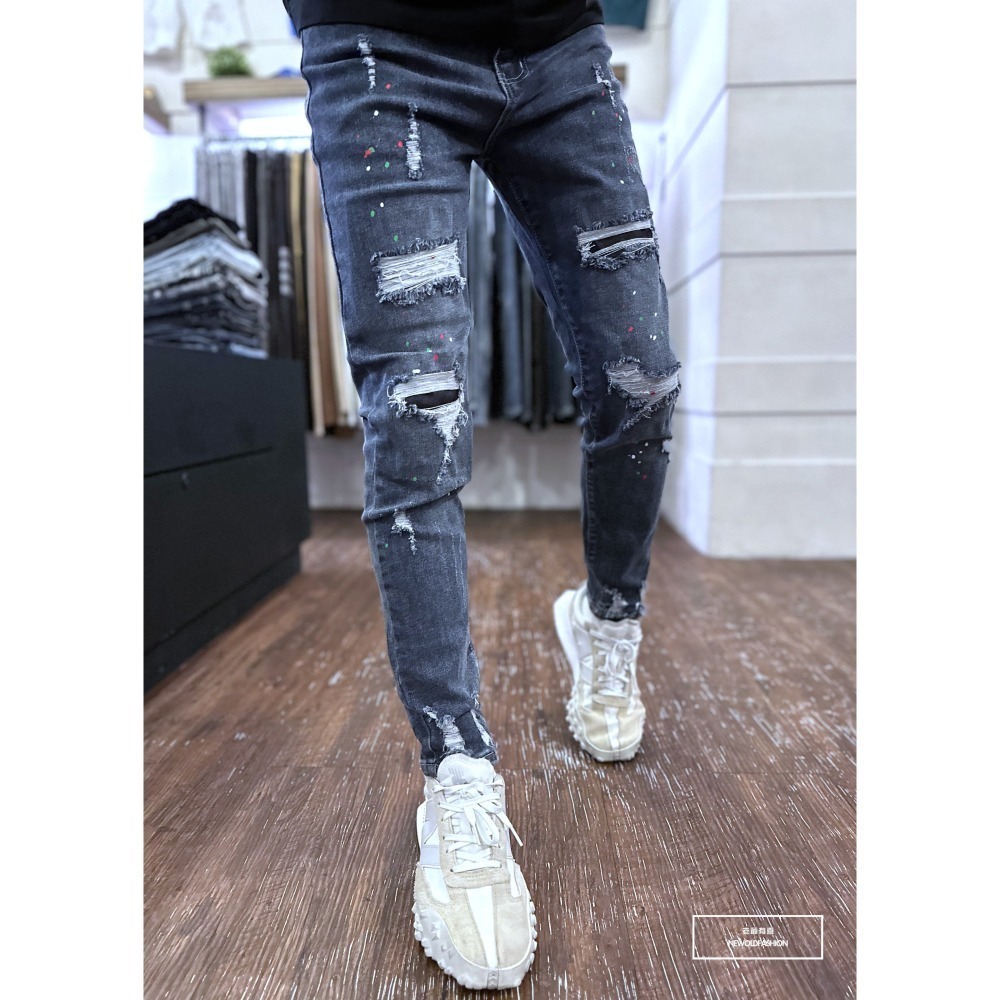 『老爺有喜』重磅潑漆破壞四洞補丁小直筒 彈性抽鬚 深色牛仔破褲 顯瘦修身窄管 補丁破壞牛仔褲(NOF22093656)