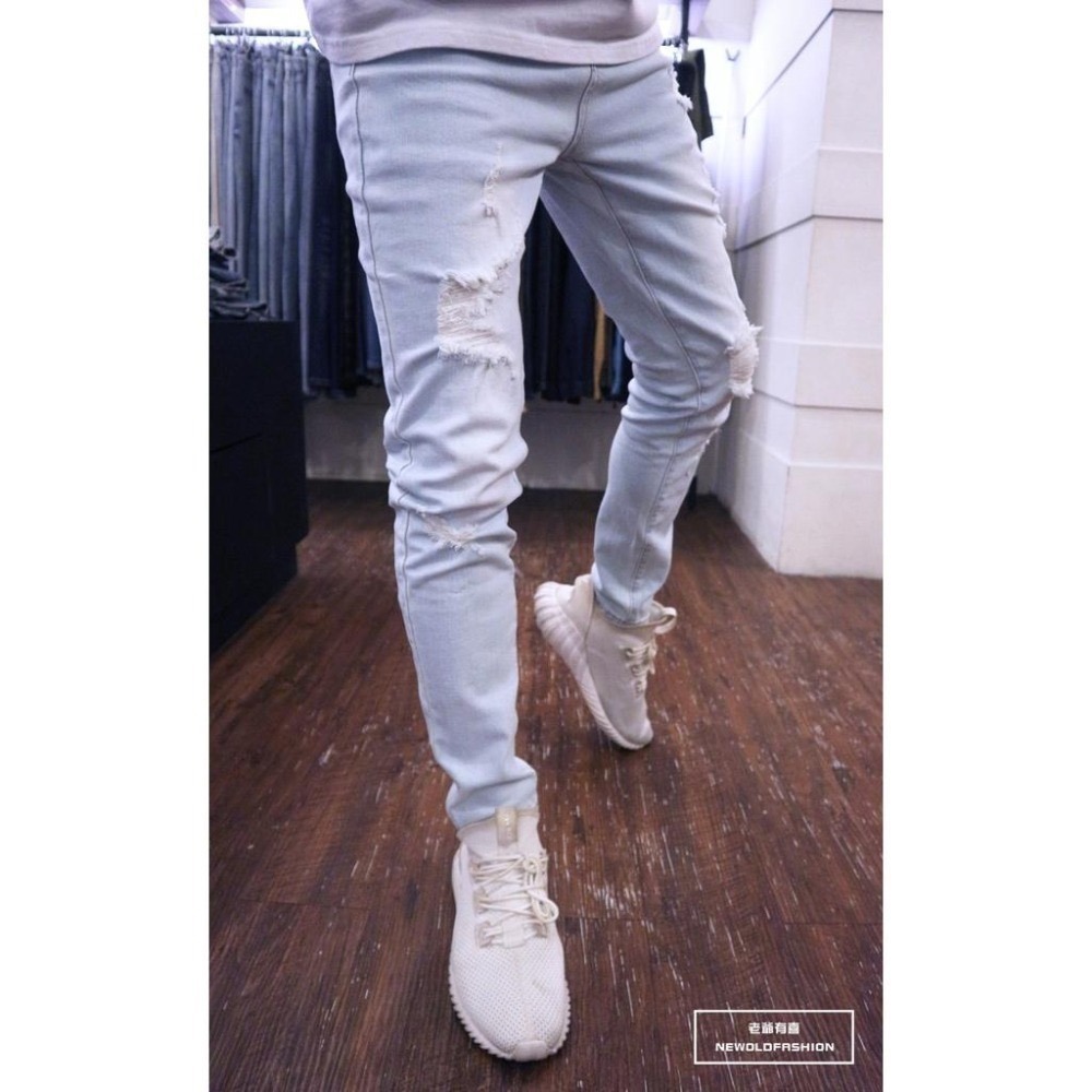 『老爺有喜』重磅極淺刷白膝破壞貓鬚牛仔小直筒褲 彈性抽鬚 牛仔破褲 顯瘦修身窄管 極淺破壞牛仔褲(NOF2003741)