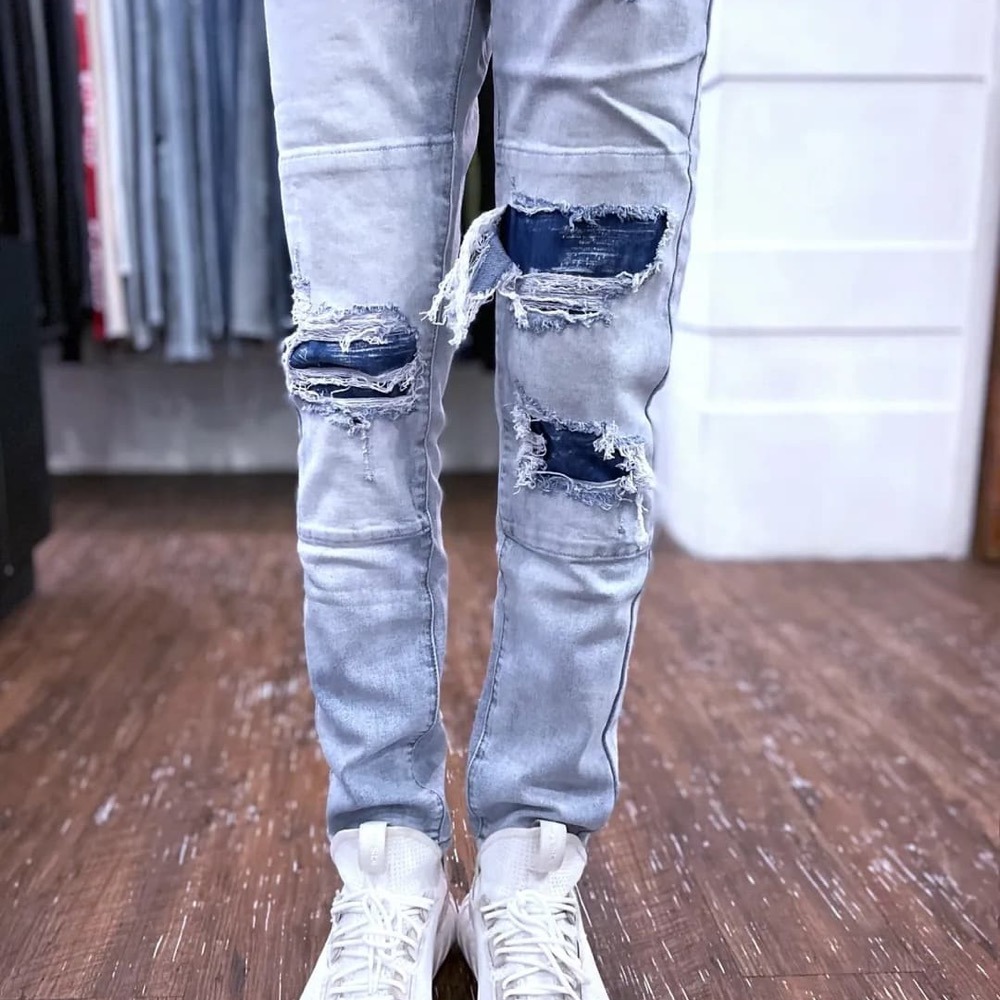 重磅淺藍刷破彈性牛仔布料!