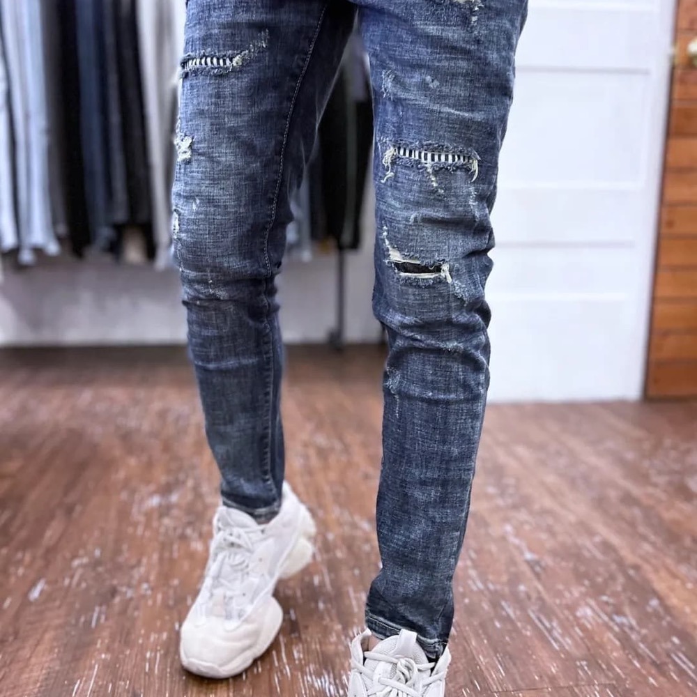 不對稱刷破、直條紋補丁造型