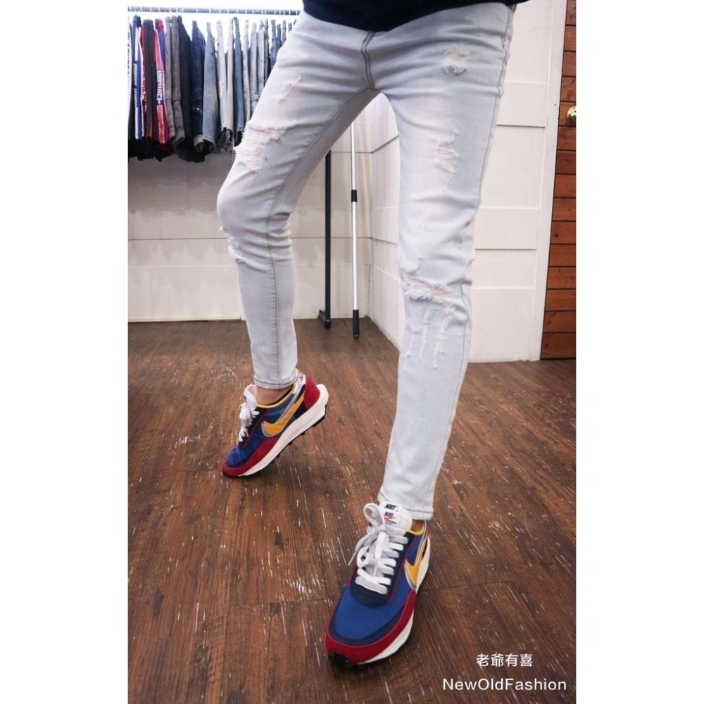 『老爺有喜』重磅淺刷白破壞貓鬚牛仔小直筒褲 彈性抽鬚 牛仔破褲 顯瘦修身窄管 補丁破壞牛仔褲 極淺刷色 水泥灰 白灰霧灰