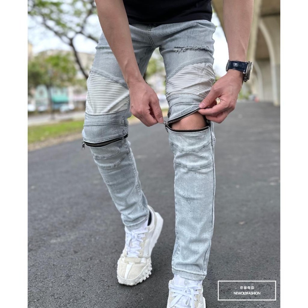 『老爺有喜』重磅淺灰白補丁膝拉鍊機車褲 皮革拼接 彈性抽鬚 牛仔破褲 顯瘦修身窄管 破壞牛仔褲(NOF2203613)
