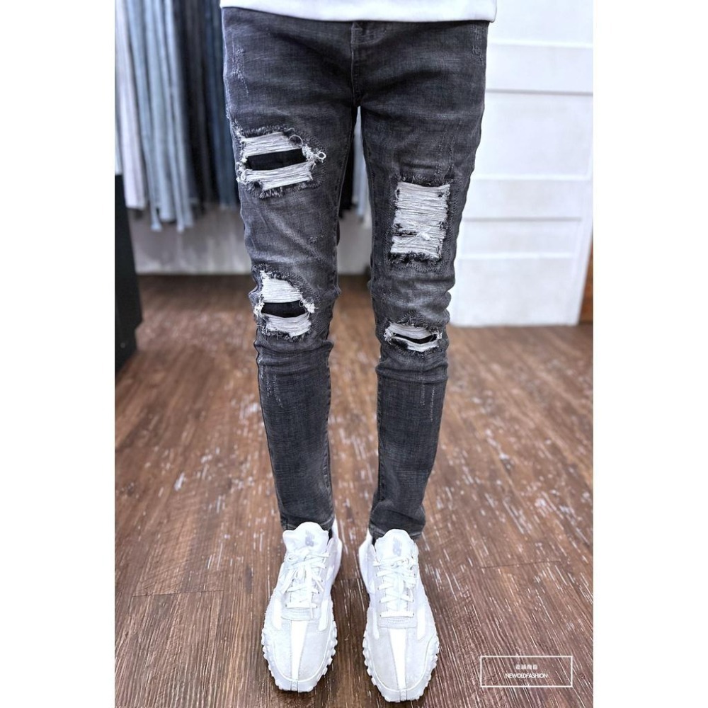 『老爺有喜』重磅仿舊黑四洞補丁小直筒 復古水洗 牛仔破褲 顯瘦修身窄管 補丁破壞 深色牛仔褲(NOF22093639)