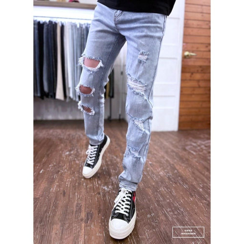 『老爺有喜』重磅不對稱多破壞小直筒褲 彈性抽鬚 牛仔破褲 顯瘦修身窄管 補丁破壞 牛仔褲(NOF22063110)