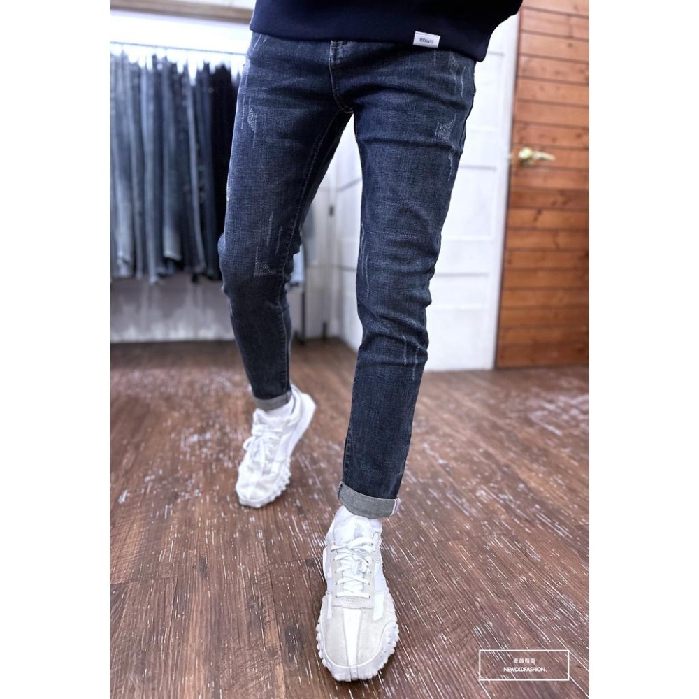 『老爺有喜』重磅深藍反折微刷痕紅藍飾帶小直筒 彈性深藍 牛仔破褲 顯瘦修身窄管 補丁破壞牛仔褲(NOF22123666)