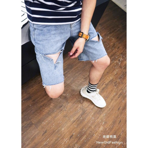 『老爺有喜』重磅深藍雙T字刀割不修邊牛仔短褲