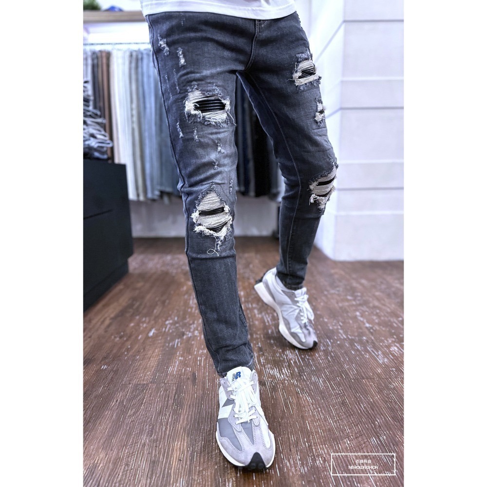 『老爺有喜』重磅五洞皮革機車補丁小直筒(NOF23085022) 彈性抽鬚 深色牛仔破褲 顯瘦修身窄管 補丁破壞牛仔褲