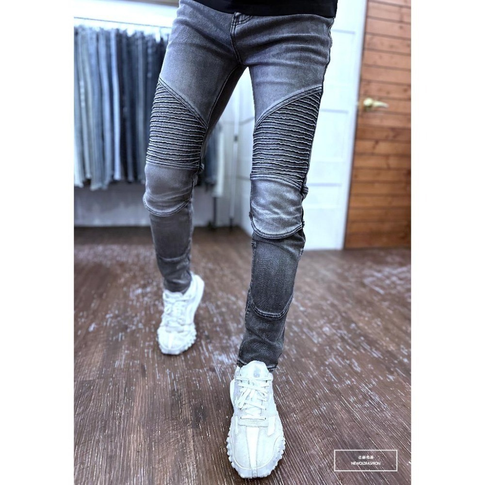 重磅水泥灰牛仔丹寧牛仔布料 機車補丁造型設計!膝蓋為立體造型,穿上後更加立體! 彈性超好!窄管修身版型! 五個尺寸(S、M、L、XL、XXL) *麻豆174/60穿M號尺寸拍照!