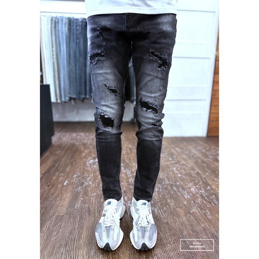 重磅黑色牛仔丹寧牛仔布料 破壞補丁刷白造型設計! 彈性超好!窄管修身版型! 五個尺寸(S、M、L、XL、XXL) *麻豆174/60穿M號尺寸拍照!