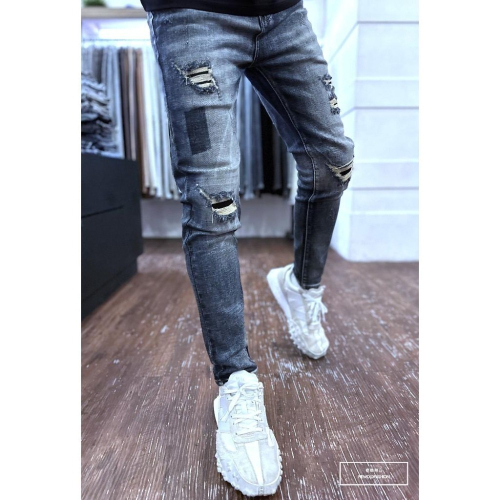 重磅深藍牛仔丹寧牛仔布料 藍印破壞補丁造型設計! 彈性超好!窄管修身版型! 五個尺寸(S、M、L、XL、XXL) *麻豆174/60穿M號尺寸拍照!