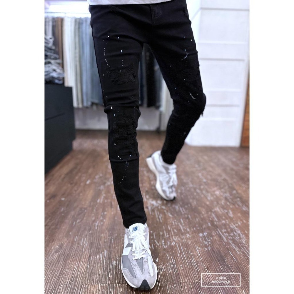 『老爺有喜』重磅暗黑雙色潑漆補丁小直筒(NOF23085061)潑漆 彈性抽鬚 深色牛仔破褲 顯瘦修身窄管 補丁破壞牛仔