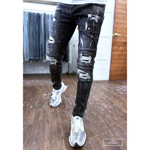 『老爺有喜』重磅仿舊黑潑漆小直筒(NOF23085001)潑漆 彈性抽鬚 深色牛仔破褲 顯瘦修身窄管 補丁破壞牛仔褲
