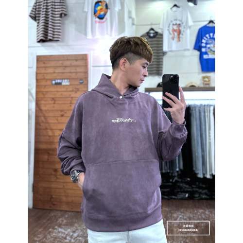 類麂皮英字刺繡造型,落肩袋鼠帶設計!