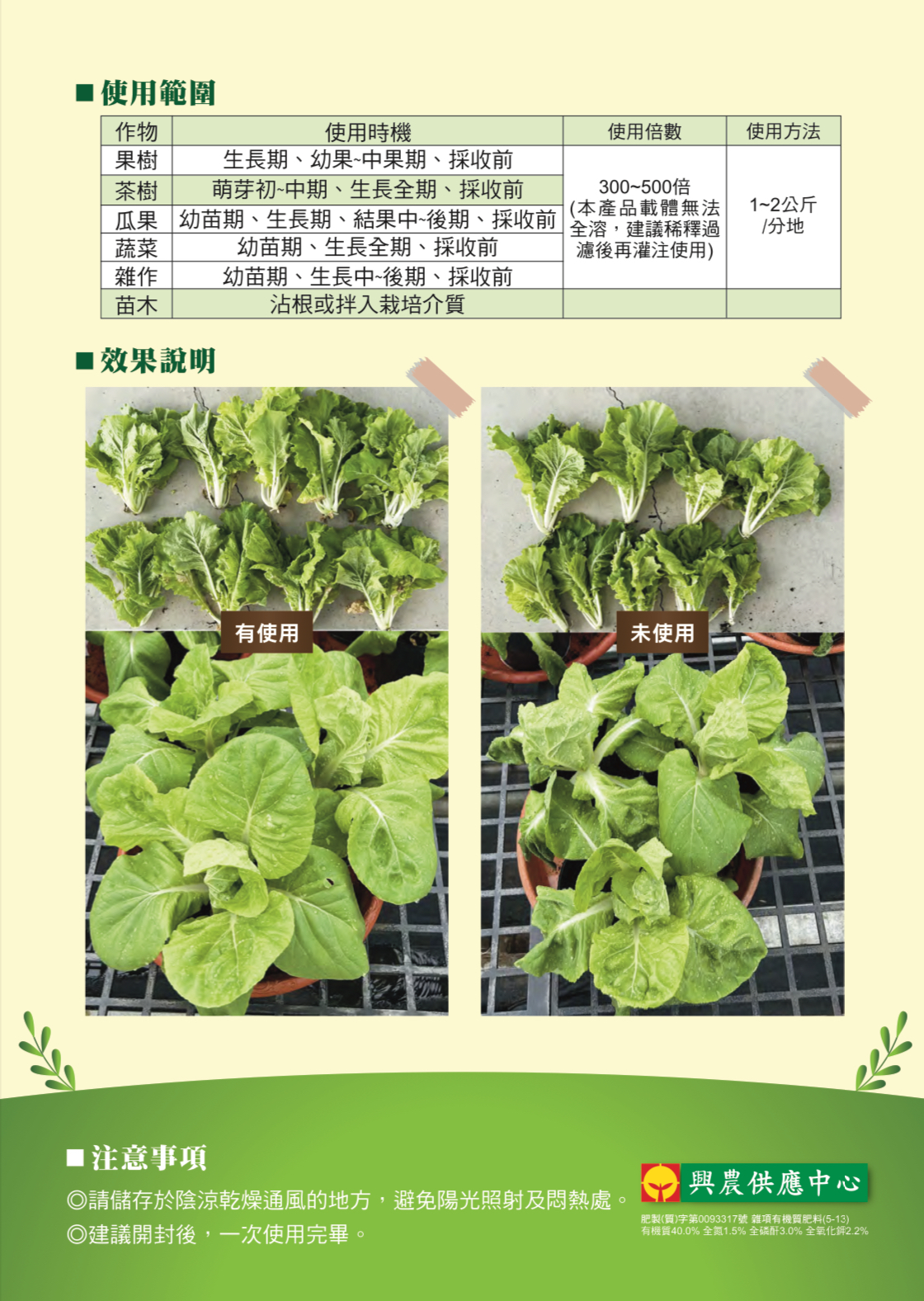 登記成分: 有機質含量40%以上、全氮1.5%、全磷酐3.0%、全氧化鉀2.2%。