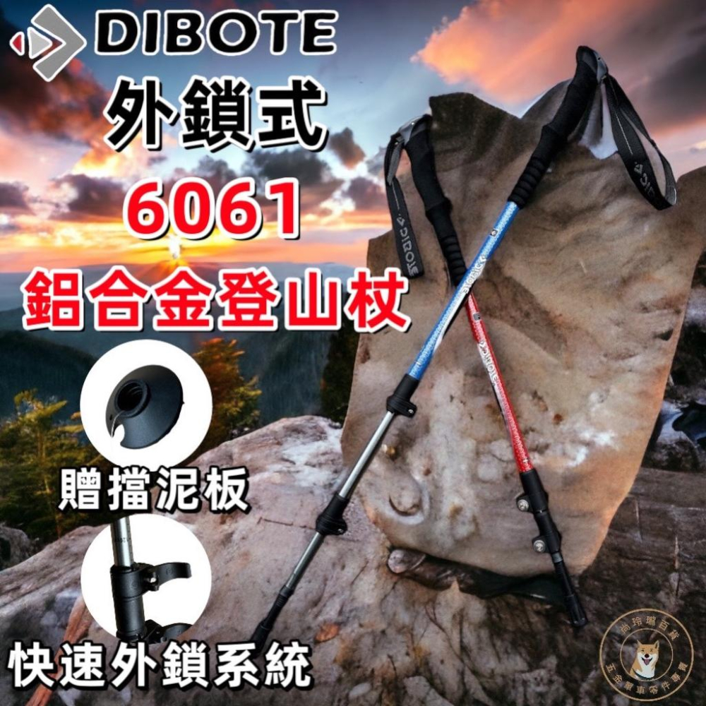 🌟品名:DIBOTE 6061登山杖 ×1 🌟 尺寸 : 伸展最長(長) 135 cm  / 收縮最短(長) 65 cm 🌟顏色:藍/綠/黃/白/紅 ◆重量:約:220g 🌟材質:握把部分採用EVA&高密度防滑材質/杖身部分是7075鋁合金/杖尖是鎢鋼頭耐磨損 🌟配件:擋泥板+防滑杖頭。 產品功能 1.三節可伸縮式杖身 2.EVA高密度防滑握把 3. 超輕量6061鋁合金 4. 外鎖式固定 更快速 5.戶外活動的最佳裝備   · 符合人體工學把手及防滑握把,手握更為舒適,有效減低長期握著之疲累 · 三段調節~長度可依照個人所需延伸,使用性更方便 · 附挽套調節帶,可防止登山杖脫落 · 附擋泥板特殊設計,使拐杖不易陷入泥巴裡! (帳底端可更換功能配件)
