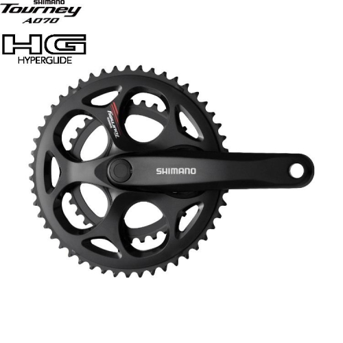 SHIMANO TOURNEY A070- 公路車前齒盤 2x8/7 速 SHIMANO TOURNEY A070 前齒盤與 2x7 和 2x8 傳動系統相容,並提供緊湊型 50-34T 齒輪檔位。其使用方錐形五通碗組介面,提供 170 mm 的曲柄臂長度。 50-34T 相容 8 / 7 速 *二盤用. 不含BB