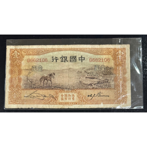 中華民國二十四年印 民國24年 中國銀行 天津 壹圓 一元 1元 德納羅印鈔公司(鴻兔小舖)