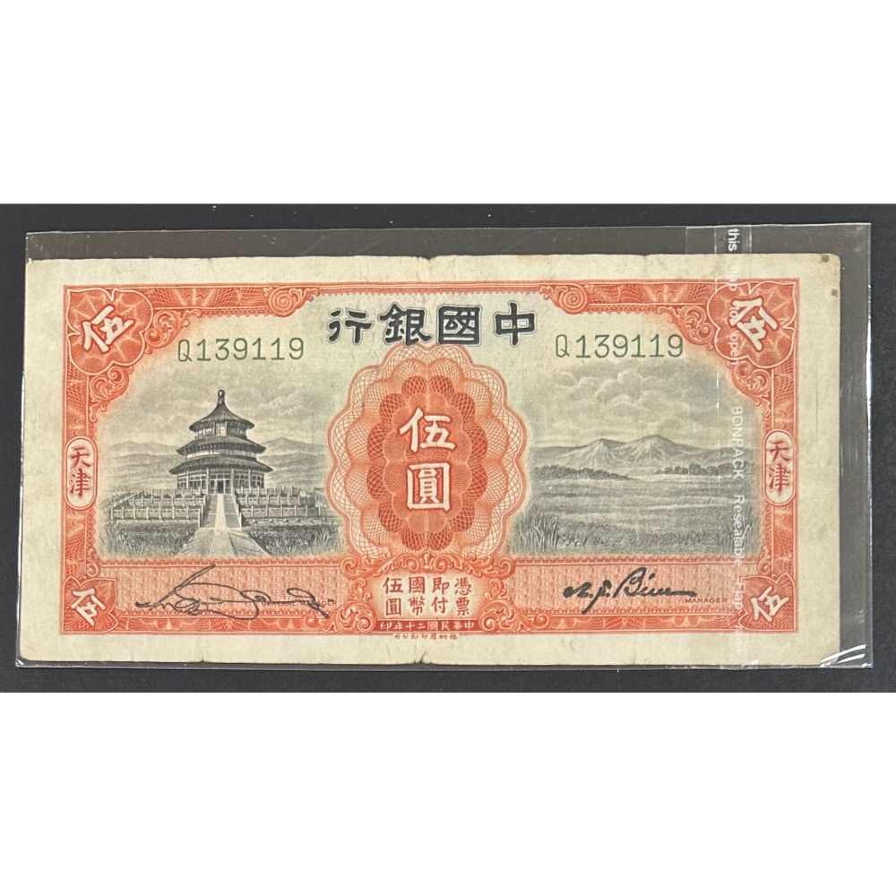 中華民國二十年印 民國20年 中國銀行 伍圓 五元 5元 德納羅印鈔公司 (鴻兔小舖)