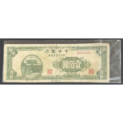 中華民國三十四年印 民國34年 中央銀行 東北九省流通券 壹佰圓 一百元 100元 中央印製廠上海廠 3/3(鴻兔小舖)