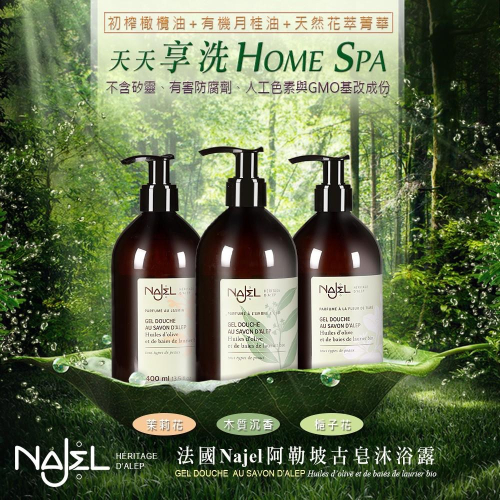 NAJEL阿勒坡經典古皂液草本保濕沐浴露400ml-木質沉香/茉莉花/梔子花