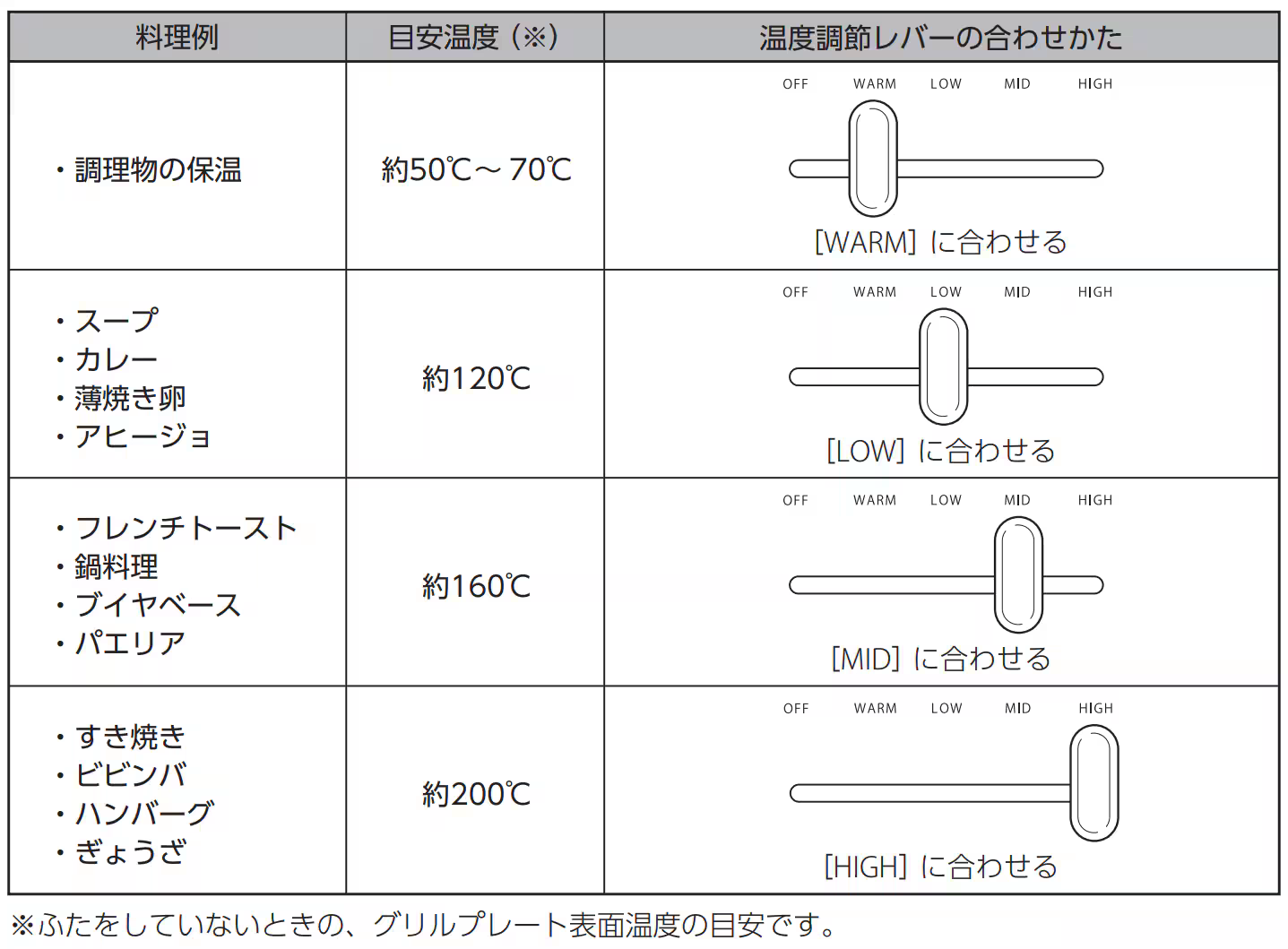 溫度指引:WARM 約 50℃ 至 70℃,LOW 約 120℃,MID 約 160℃,HIGH 約 200℃