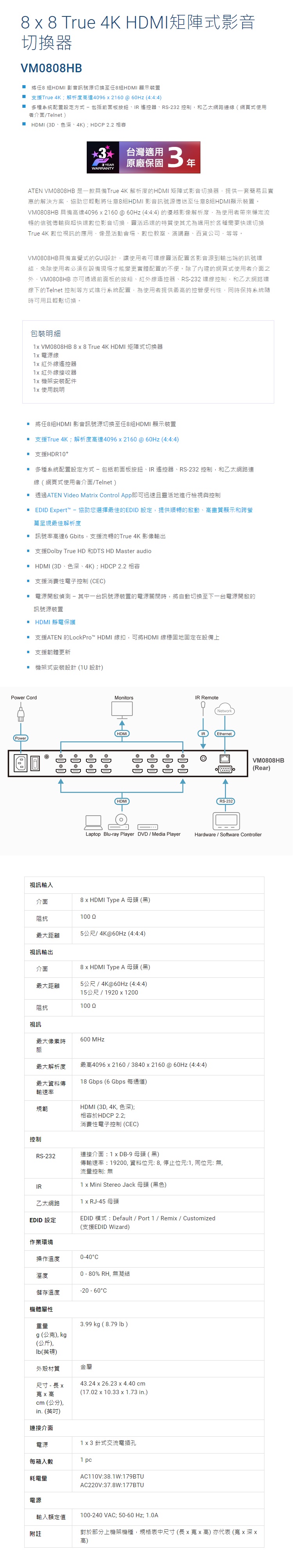 ATEN 8x8 Ture 4K HDMI矩陣式切換器 (VM0808HB)