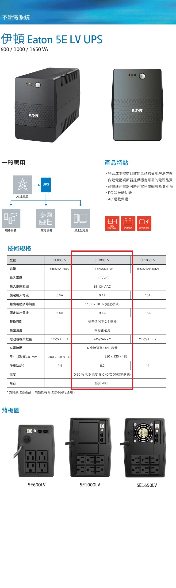 伊頓 5E LV系列是在線互動式UPS,當停電和電力品質不佳時,內建電壓調節器提供穩定可靠的電源品質