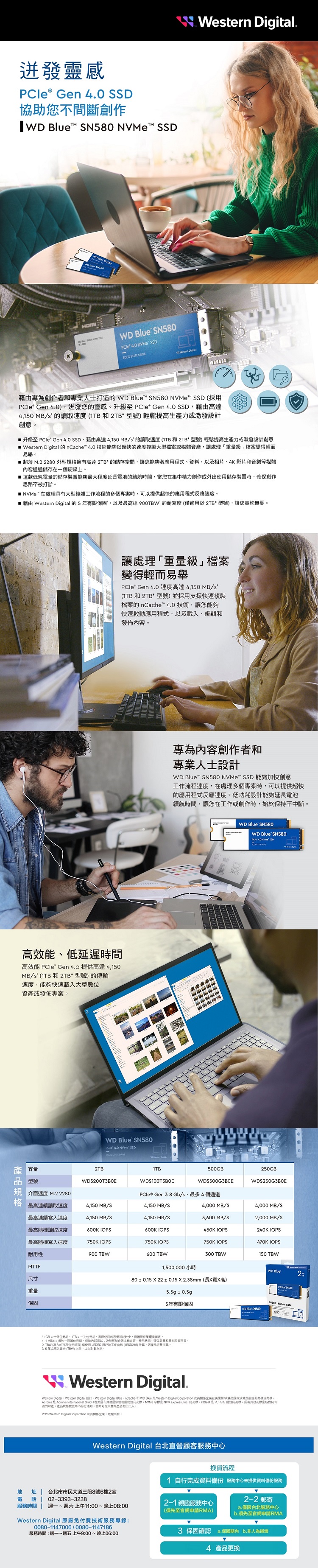 WD 藍標 SN580 500GB NVMe M.2 PCIe 4.0 SSD 固態硬碟 WDS500G3B0E