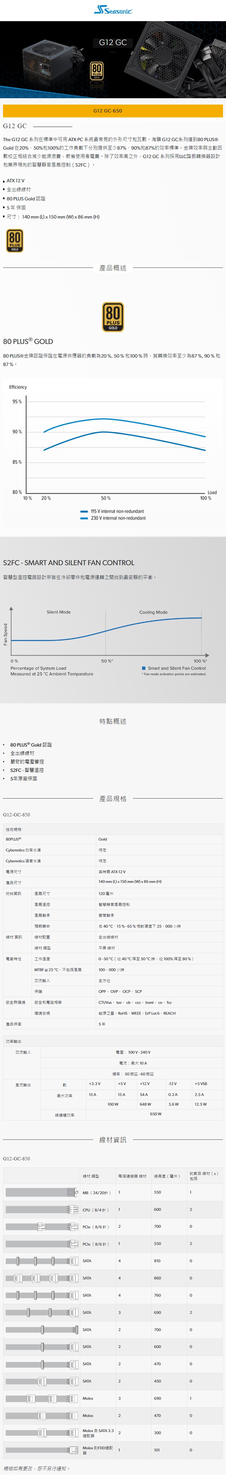 Seasonic 海韻 G12 GC-650 金牌 80 PLUS直出650W 電源供應器