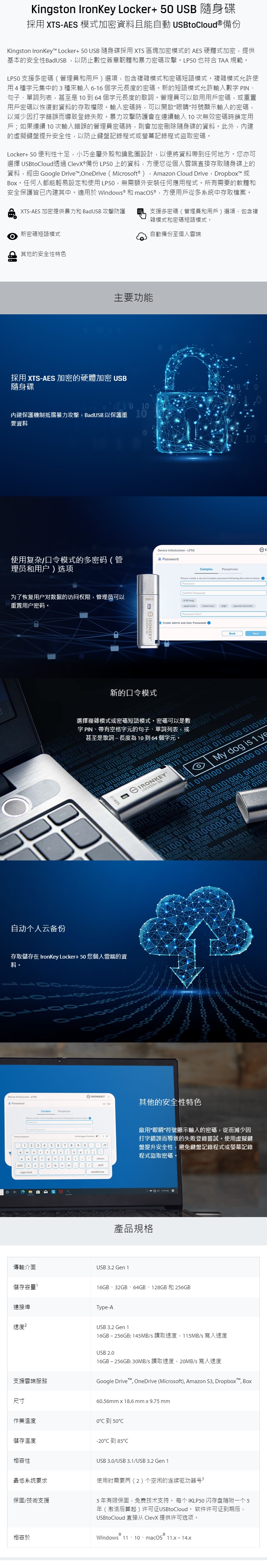 Kingston 金士頓 IronKey Locker+ 50 16G 硬體型加密隨身碟 IKLP50/16GB