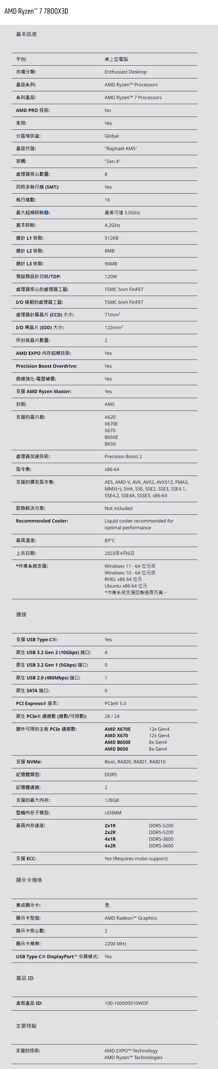 AMD Ryzen 7 7800X3D R7-7800X3D 8核16緒 盒裝中央處理器100-100000910WOF