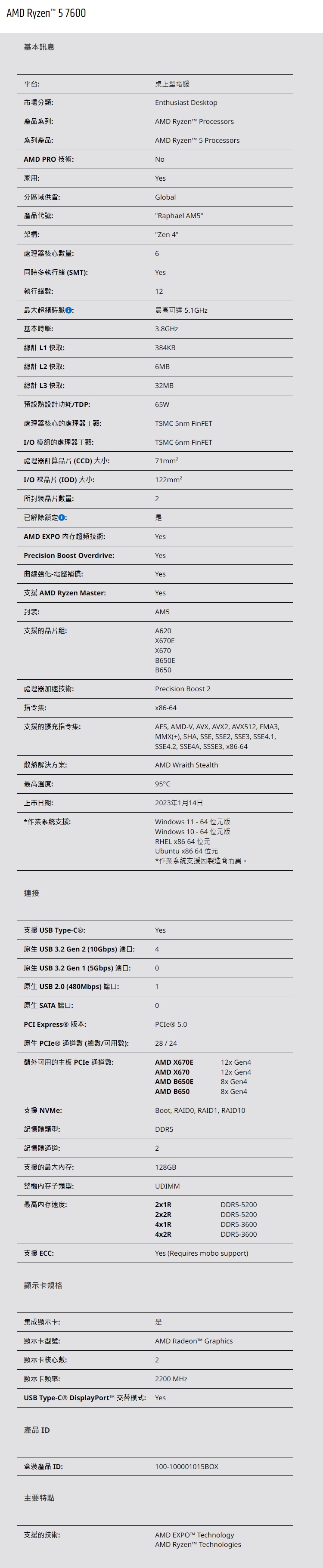 AMD Ryzen 5 7600 R5-7600 6核12緒 盒裝中央處理器 100-100001015BOX