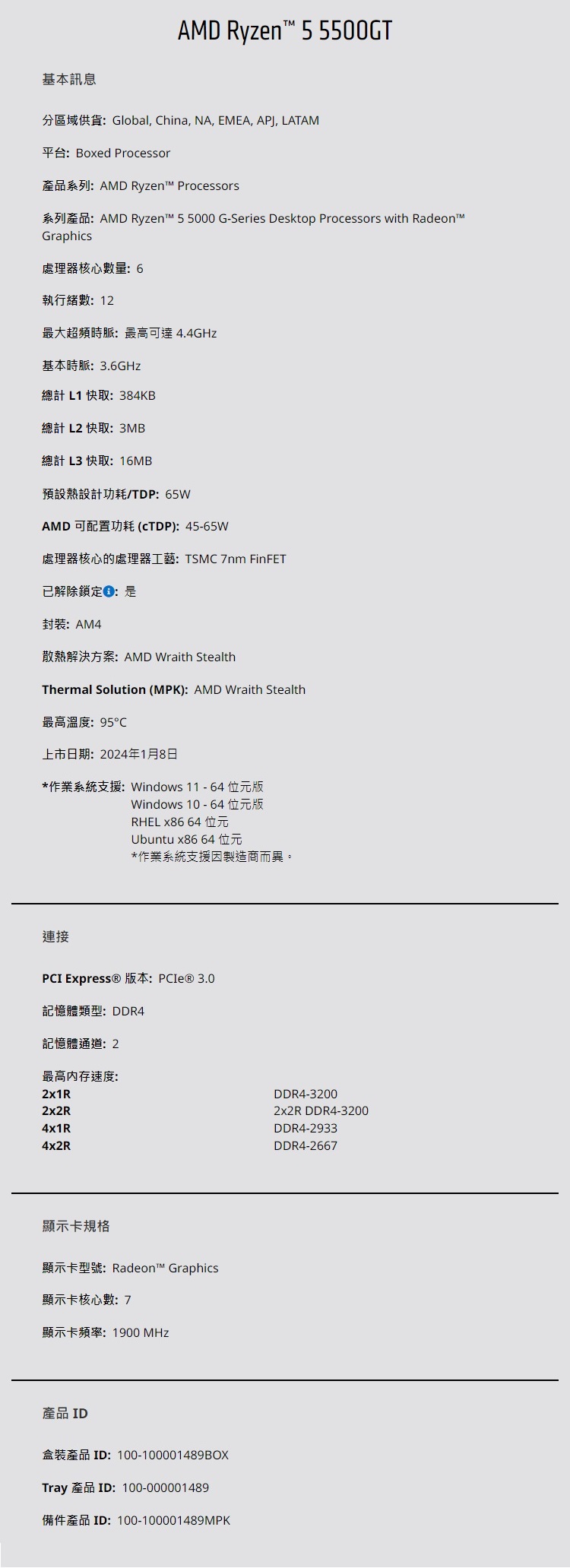 AMD Ryzen 5 5500GT R5-5500GT 6核12緒 盒裝中央處理器 100-100001489BOX