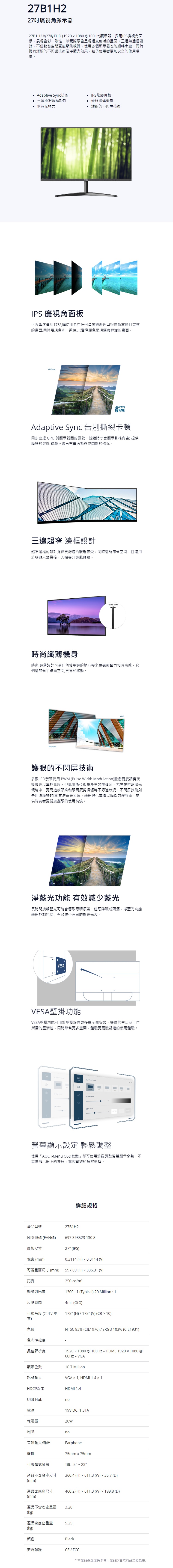 AOC 艾德蒙 27型 液晶顯示器(黑) 27B1H2