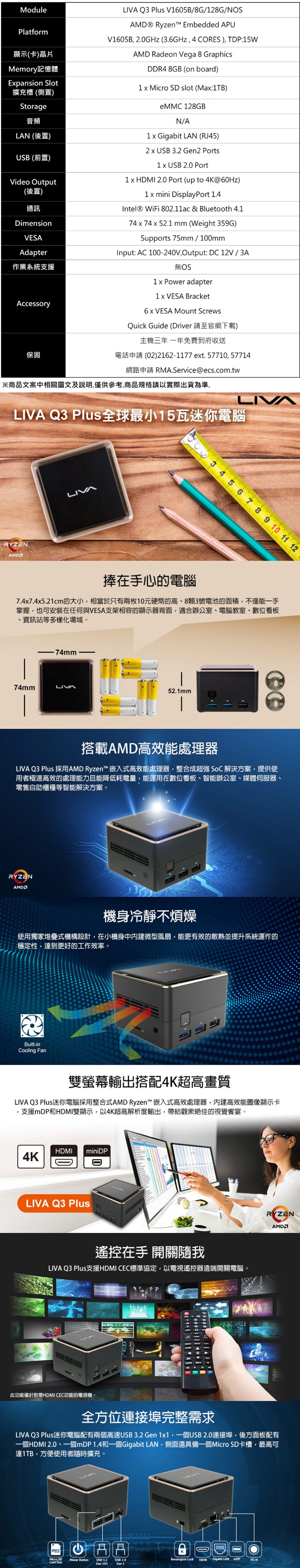 ECS 精英 LIVA Q3 Plus 四核心迷你電腦(V1605B/8G/128G/NOS)