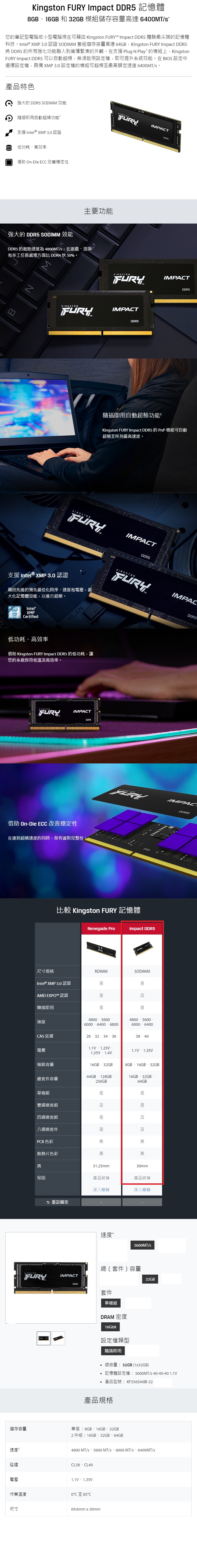Kingston 金士頓 FURY Impact DDR5 5600 32GB 筆記型超頻記憶體 KF556S40IB-32