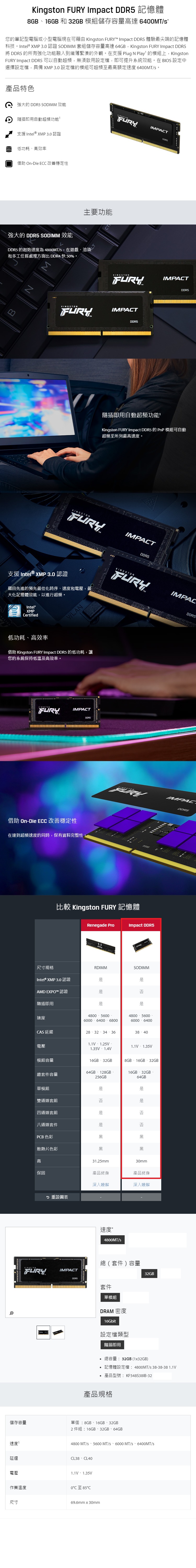 Kingston 金士頓 FURY Impact DDR5 4800 32GB 筆記型記憶體 KF548S38IB-32