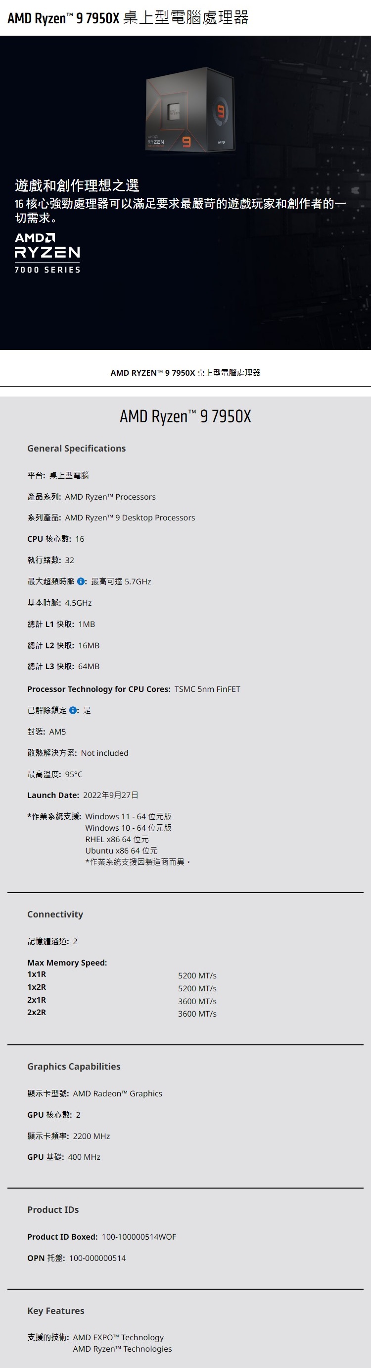 AMD Ryzen 9 7950X R9-7950X 16核32緒處理器 100-100000514WOF