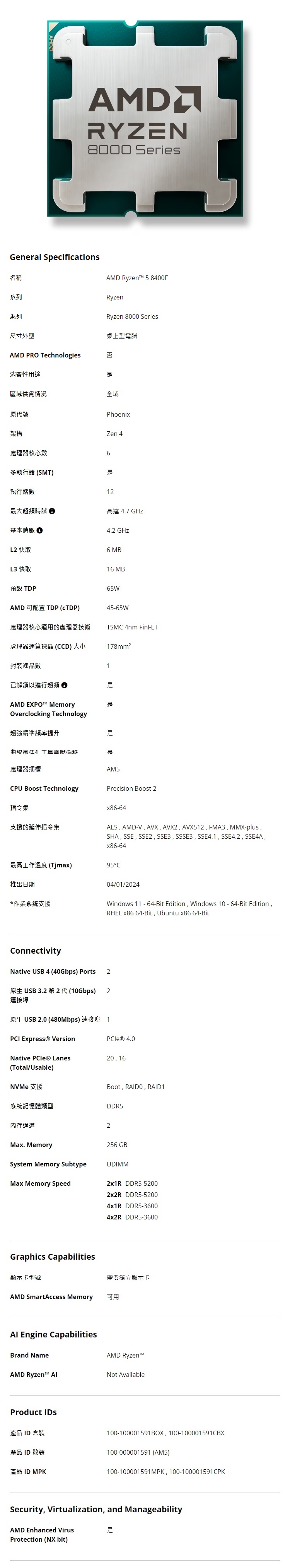 AMD Ryzen 5 8400F R5-8400F 6核12緒 盒裝中央處理器 100-100001591BOX